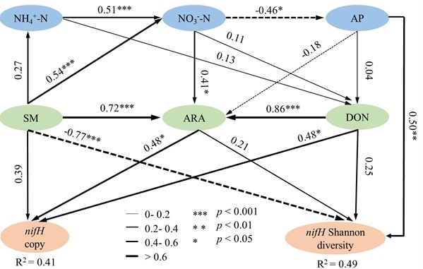 研究结果表明,(1)固氮菌群落慢生根瘤菌属(Bradyrhizobium)的相对丰度在喀斯特草地中占绝对优势,可作为脆弱生态系统植被恢复的候选优势属;(2)自然草地生态系统,氮添加和高密度种植深紫木蓝在生长季通过提高土壤氮可利用性降低固氮菌丰度,同时氮添加显著降低固氮速率,磷添加和深紫木蓝在生长季显著提高固氮菌多样性及显著影响固氮菌群落组成(图1和2);(3)人工牧草地,紫穗槐种植和低水平氮肥施用通过增加土壤氮的可利用性从而降低了固氮菌群落间竞争,固氮菌群落间的竞争在氮肥处理高于紫穗槐,表明豆科灌木有利于提高固氮菌多样性,有效改善土壤氮输入(图3);(4)总体而言,喀斯特草地管理过程低密度种植深紫木蓝通过改善固氮菌群落促进养分吸收,是喀斯特自然草地缓解氮限制的有效途径,在此过程,土壤有效磷的含量相比氮可利用性通过提高固氮菌的多样性有利于生物固氮。研究结果为喀斯特脆弱生态系统土壤氮素的优化管理和高效恢复策略的筛选提供科学依据。