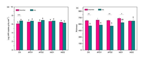 图2 自然草地高低密度种植紫穗槐(AF)和深紫木蓝(IA)对固氮菌丰度和物种丰富度的影响