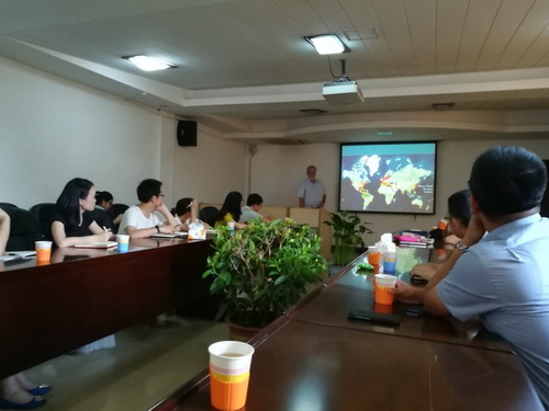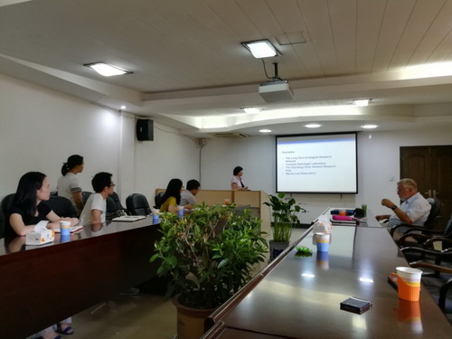 张立教授以Implementing long-term real-time wetland monitoring network in South Florida, USA为题,介绍了美国在湿地生态系统研究网络的概况,并介绍了目前团队在淡水沼泽湿地、盐水湿地和人工湿地方面布设检测点的情况和主要研究结论。随后与洞庭湖站人员就检测指标的选择、仪器的使用及数据分析等问题进行了深入的探讨。