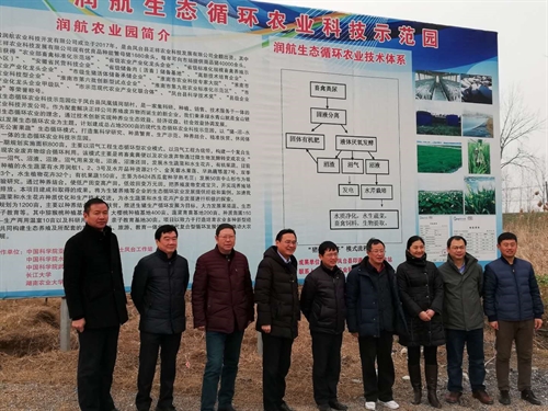 印遇龙详细了解了实验示范基地的基本情况,基地生态循环利用流程后,对该基地利用沼液生产水生蔬菜和水产品的技术和模式给予高度评价。该实验示范基地有年出栏4万头生猪规模,沼液的量很大,通过以沼气工程为纽带,构建了一个复合生态链,实现养殖废弃物综合循环利用。主要是将畜禽粪便通过黑膜发酵转变成农业“三宝”——沼气、沼液、沼渣。沼气用来发电,沼液、沼渣还田。目前园区引进种植的水生蔬菜及植物:水芹润航1、2、3号及水芹品种资源21个、金芙蓉水果莲、早熟藕鄂莲7号、双季茭白品种3个,水生植物花卉32个;发展50亩中山杉作为吸纳沼液试验研究。通过技术创新,采用莲藕-水芹、空心菜-水芹、中山杉-水芹加水产等种养结合模式,做到阴阳搭配、喜热与耐寒搭配、地栽与浮床搭配、水生经济植物与水产搭配。使养殖废物就近就地资源化周年高效利用,低产田变高产田,低效田变万元田,养殖废物变成宝贝,养殖场零污染零排放。实现了种养业生态效益、经济效益、社会效益协调发展。印院士希望“润航”落实院士工作站各项工作任务,充分利用国家工程实验室平台,使实验示范基地出成果、出效益,在发展生态循环农业示范引领、创造自身价值的同时,积极完善技术方案,加大宣传和技术推广力度。