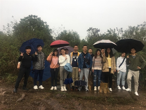 研究生们首先乘车前往梅西湖畔桃花岭公园开展徒步活动,冒雨攀爬桃花岭并沿途了解了该湿地公园土壤特征及动植物资源概况。尽管天气不好,但同学们兴致很高,纷纷利用自己的专业知识与身边的同学讨论交流。沿途拿出手机,使用植物识别软件进行识别与学习。之后,同学们一同前往欢魔方主题公园开展素质拓展团建活动。