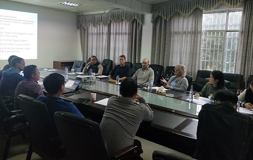 考察期间,同时在环江站召开了主题为Workshop on Understanding Human Factors behind Vegetation Changes in China Karst的研讨会,岳跃民研究员做了China karst conservation and human factors behind vegetation recovery的研究报告,介绍了环江站概况与长期观测研究体系、主要研究成果、石漠化治理成效评估及存在的主要问题、人为因素对喀斯特生态恢复的影响及喀斯特参与式社会调查初步成果;Rasmus Fensholt、Xiangming Xiao、Jytte Larsen、Martin Jepsen、 Alexander Prishchepov等分别介绍了其所开展的主要研究工作及研究兴趣。国外专家对喀斯特生态恢复研究表现出浓厚的兴趣,围绕如何结合长期定位观测、模型模拟、遥感及社会科学权衡自然恢复与人工造林、优化石漠化治理工程展开了深入的讨论。Rasmus Fensholt教授表示其团队将继续支持环江站开展的喀斯特区域生态恢复成效评估工作,进一步拓展推进喀斯特人地系统耦合机理合作研究。参会专家就未来合作开展基于深度学习的喀斯特遥感大数据信息提取、喀斯特生态修复的潜在生态风险识别、生态恢复的社会人文驱动机制等方面达成合作共识。