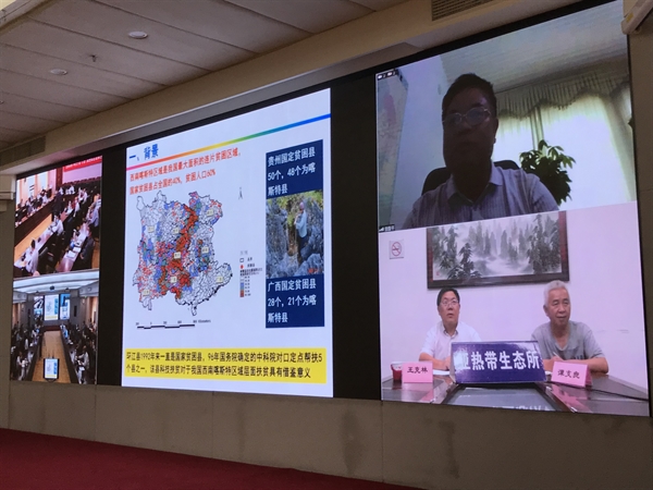 5月29日,中国科学院召开党组理论中心组学习会,专题组织学习习近平总书记关于毛南族整族脱贫批示精神,亚热带生态所党委书记王克林,所长谭支良,环江喀斯特生态系统观测研究站副站长、环江县科技副县长曾馥平通过视频会议参加。