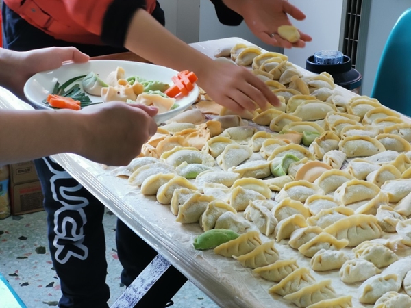 刚下锅的饺子热气腾腾,且各有特色,有的饺子个大肚圆彰显北方的大气豪迈,有的饺子美观精致展现南方的秀气灵动,有的饺子放飞自我昭示着随性自然不拘一格,还有煎饺、烙馅饼等花样操作。同学们品尝着暖冬的饺子,脸上洋溢着快乐的笑容。