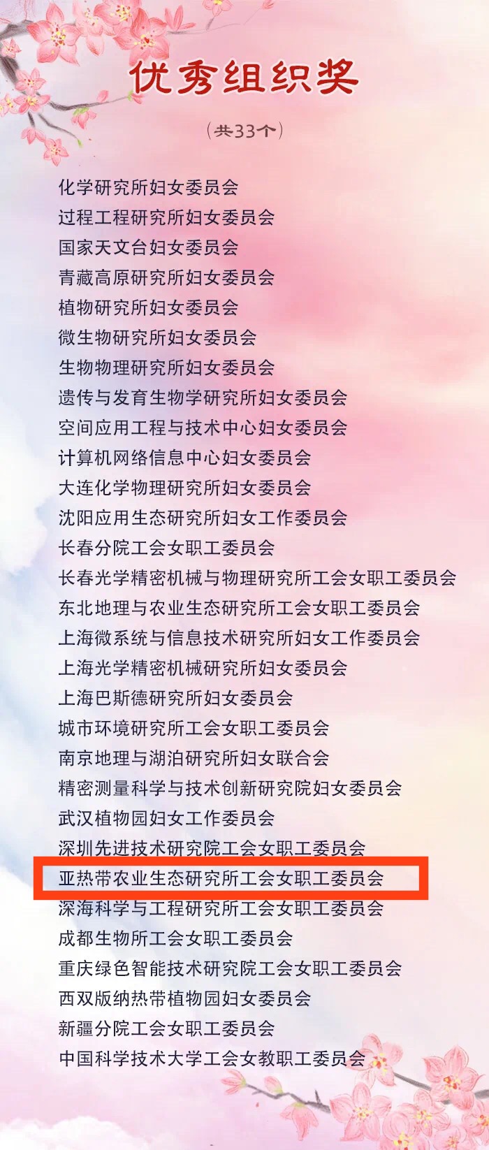 7月7日,中国科学院妇女工作委员会、中国科学院工会女职工委员会公布2022年“科苑女性活动月”获奖名单,中国科学院亚热带农业生态研究所工会女工委首次获评该项目“优秀组织奖”。