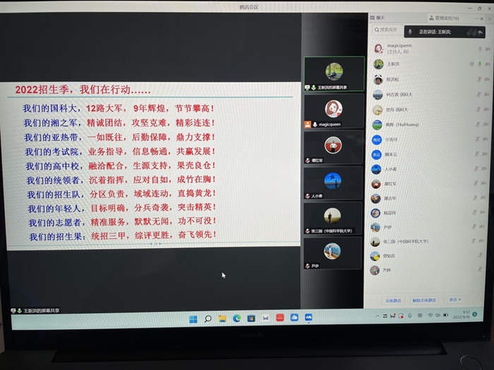 9月16日,中国科学院大学(简称”国科大“)湖南招生组通过线上方式召开组内本科招生工作总结会,全体湖南招生组组员参加。